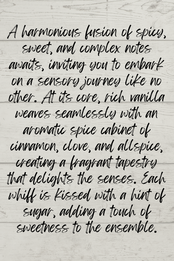 A harmonious fusion of spicy, sweet, and complex notes awaits, inviting you to embark on a sensory journey like no other. At its core, rich vanilla weaves seamlessly with an aromatic spice cabinet of cinnamon, clove, and allspice, creating a fragrant tapestry that delights the senses. Each whiff is kissed with a hint of sugar, adding a touch of sweetness to the ensemble.