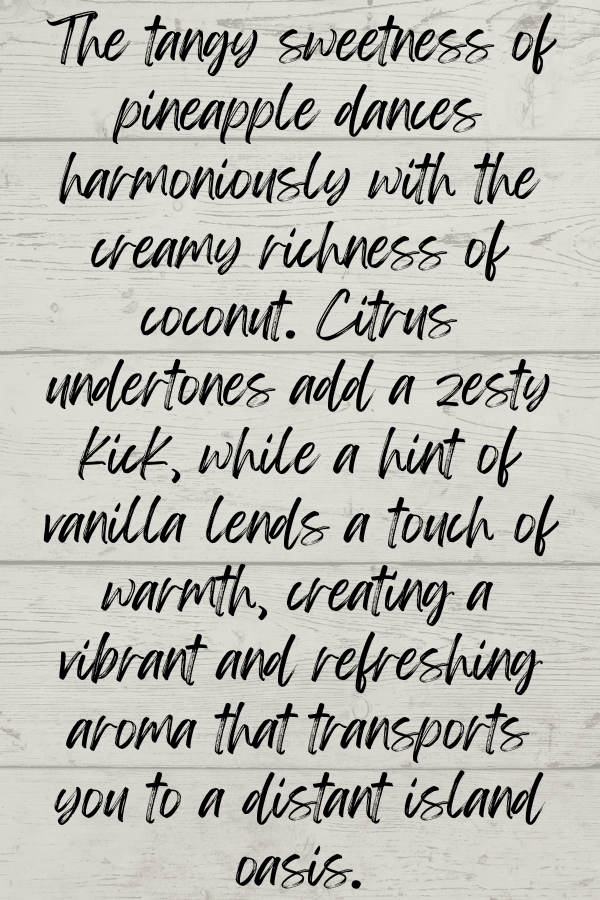 The tangy sweetness of pineapple dances harmoniously with the creamy richness of coconut. Citrus undertones add a zesty kick, while a hint of vanilla lends a touch of warmth, creating a vibrant and refreshing aroma that transports you to a distant island oasis.