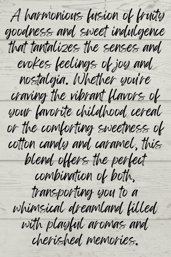 A harmonious fusion of fruity goodness and sweet indulgence that tantalizes the senses and evokes feelings of joy and nostalgia. Whether you're craving the vibrant flavors of your favorite childhood cereal or the comforting sweetness of cotton candy and caramel, this blend offers the perfect combination of both, transporting you to a whimsical dreamland filled with playful aromas and cherished memories.