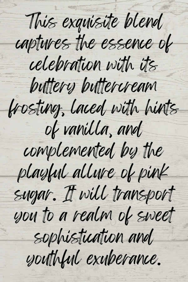 This exquisite blend captures the essence of celebration with its buttery buttercream frosting, laced with hints of vanilla, and complemented by the playful allure of pink sugar. It will transport you to a realm of sweet sophistication and youthful exuberance.